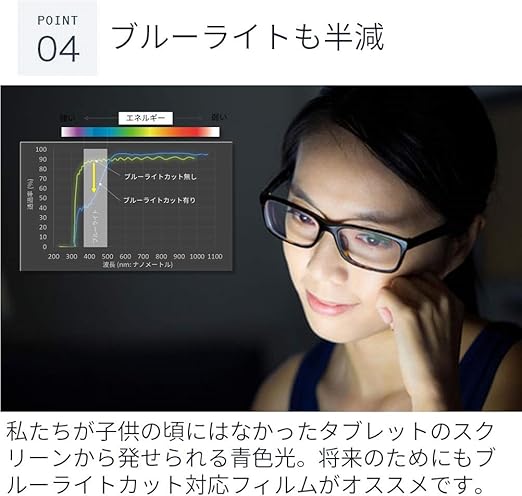 [ ブルーライト半減 ] 私たちが子供の頃にはなかったタブレットのスクリーンから発せられる青色光。 毒性の強いブルーライトは眼精疲労や体内リズムへの影響が益々懸念されています。 本製品はブルーライトを約50%低減。将来のことを考えるならブルーライトカット対応フィルムがオススメです。反射率5.8%とアンチグレアで光の映り込みもほとんどありません。