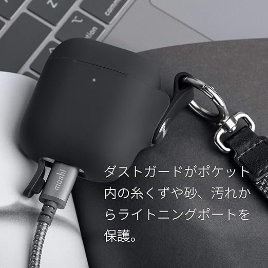 利便的設計:リストストラップが付属しているためAirPods Proを持ち運び外出先でも安全に保管できます。 ダストガードは、ポケットの糸くず、砂、ほこり、汚れがライトニングポートを詰まらせないようにします。