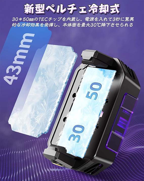本製品は高性能ペルチェ素子(24W/50*30㎜TEC)を採用したスマートフォンクーラーです。電源を入れて3秒ほど驚異的な冷却効果を発揮します。