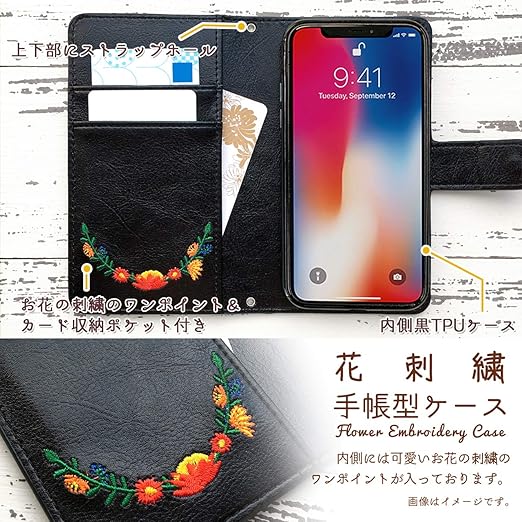 シンプルスマホ4 704SH 花刺繍 ケース カバー 手帳型 ケース カバー 【リリーブラック】 [内側黒TPU] 704SHケース 704SHカバー1