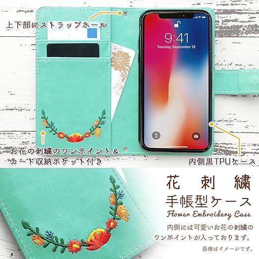 Libero 5G IV A302ZT ケース カバー 手帳型ケース A302ZTケース A302ZTカバー リベロ Libero5GIV 【NB】 花刺繍 ペパーミントグリーン green