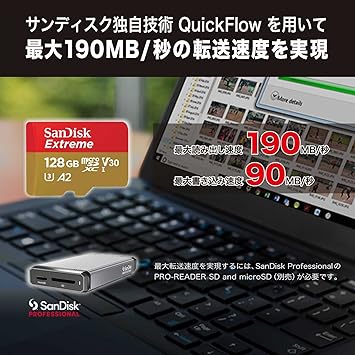 サンディスク独自のテクノロジーを用いて最大読取り速度190MB/秒、最大書込み速度90MB/秒のデータ転送を実現 ビデオスピードクラス 30 (V30 )、UHSスピードクラス3( U3 )とCLASS10に対応し、4K動画やフルHD動画に対応
