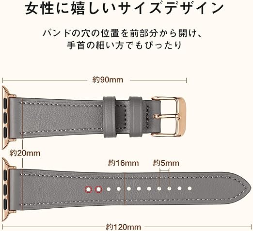 対応機種:(130mm-190mm)の手首にフィットします。iWatch Series 10/9/8/7/6/5/4/3/2/1/SE/SE2に対応しています。バンドの最小幅は16mmで、小さい穴が11つ開いているため、女性の方々にぴったりのサイズ感があり、大人女性に人気のスリム仕様です。エレガントなデザインで、まるでアクセサリーのように手首を細く見せ、フェミニンな外観を演出します。