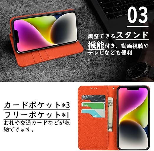 BESTMADE-JP Clicsun iPhone14 Plus ケース 高級牛本革ケース 手帳型 アイフォン14プラス カバー 本革 レザー カバー スタンド機能 ストラップ付き マグネット式 カードポケット ギフトボックス付き ブラウンxオレンジ