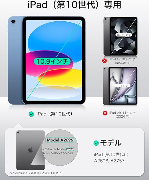 【互換性】:iPad 第10世代 (10.9インチ、2022モデル) 専用です。モデル番号:A2757、A2696、A2777。その他のiPadモデルと互換性がありませんので、ご購入する時はお使いのiPadの裏面にあるモデル番号を確認してください