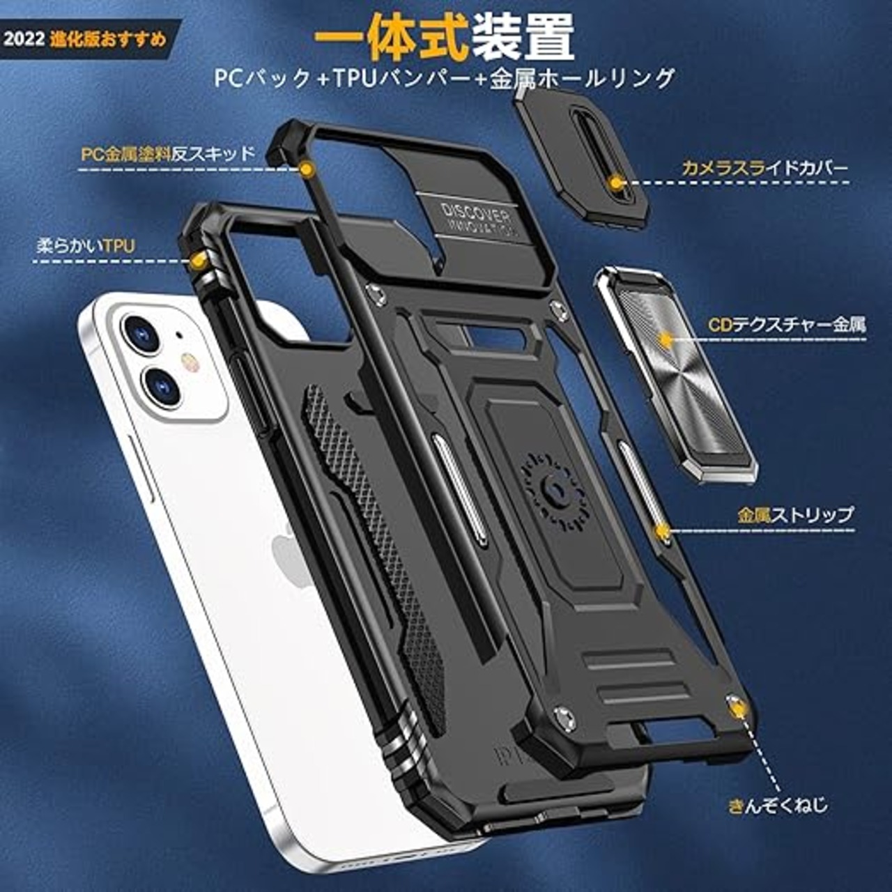 Google Pixel 7 Pro 用 ケース リング付き スライド式カメラプロテクター付き PC 米軍MIL規格取得 耐衝撃 スタンド機能 車載ホルダー対応 擦り傷防止 滑り止め 格好いい おしゃれ 人気 グーグル ピクセル 7pro カメラカバー 黒 MD-KJ-13-01