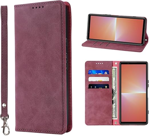 NanHou Xperia 5 V ケース 手帳型 つや消し レザー スタイル質感 カバー 手帳型 耐衝撃 保護 SO-53D SOG12 カバー 内蔵マグネット 財布型 携帯カバー カードポケット スタンド機能 リストバンド Sony エクスペリア 5V 手帳型 - ダークレッド