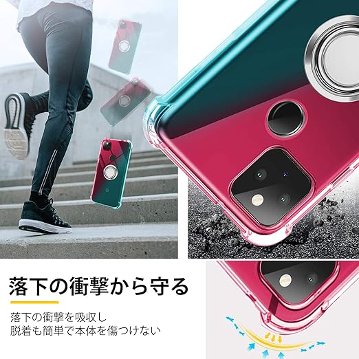 Google Pixel 5 ケース リング クリア TPU シリコン リング付き薄型 グラデーション色 ケース 軽量シリコン 耐衝撃 指紋防止 車載ホルダー対応 360回転 一体型 人気 携帯カバー(ピンクグリーン)1