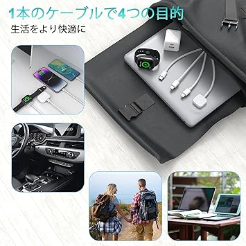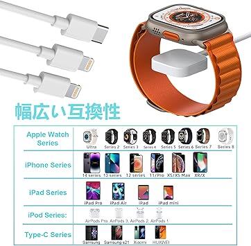 【多機能充電ケーブル】4イン2 iPhone Watch用充電ケーブルは2-in-1 USB A/Type Cポートを搭載し、デザインは磁気ウォッチ充電器、Type-Cと2*iPhoneコネクタが含まれています。すべてのiWatchシリーズ、iPhone、iPod、Type C Android携帯電話に対応し、1本のケーブルで4つの異なるニーズを満たします。1本のウォッチ充電器で4台のデバイスを同時に充電できます。複数の充電ケーブルを持ち運ぶ手間を省き、このApple Watch充電器はあなたの