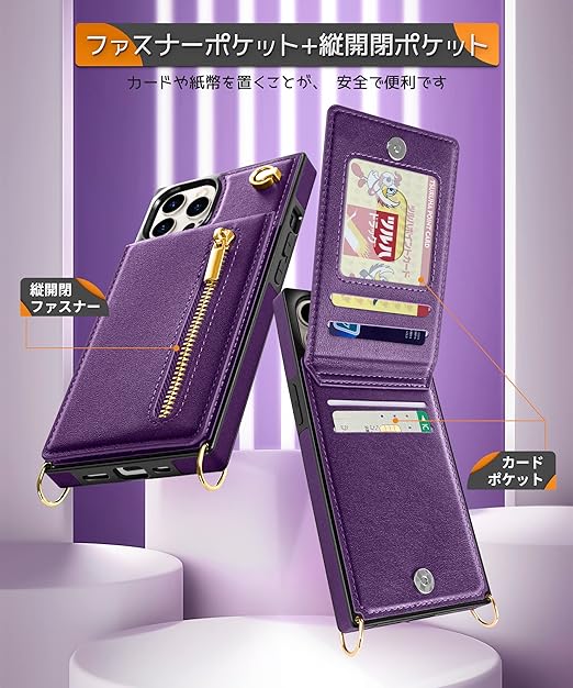 YIHARA iphone 15 Pro ケース手帳型 アイフォン15プロ スマホ ケース 財布型 iPhone 15 Pro 適用 携帯ケース 肩掛け 首かけ 斜めがけ ショルダー アイフォン15 Proケース手帳型 背面 カード収納 ストラップ付き 上下開 長さ調整可能 パープル a