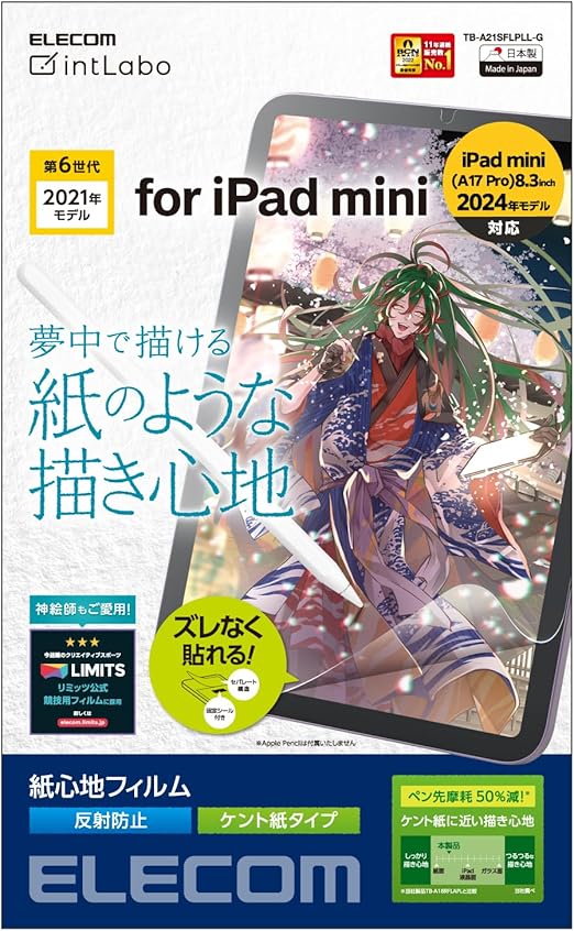 iPad mini(A17 Pro)、iPad mini 第6世代の液晶画面を傷や汚れから守る、指紋防止、反射防止タイプの紙心地フィルムです。特殊表面形状デザインによりケント紙に鉛筆で描いたような描き心地を実現します。