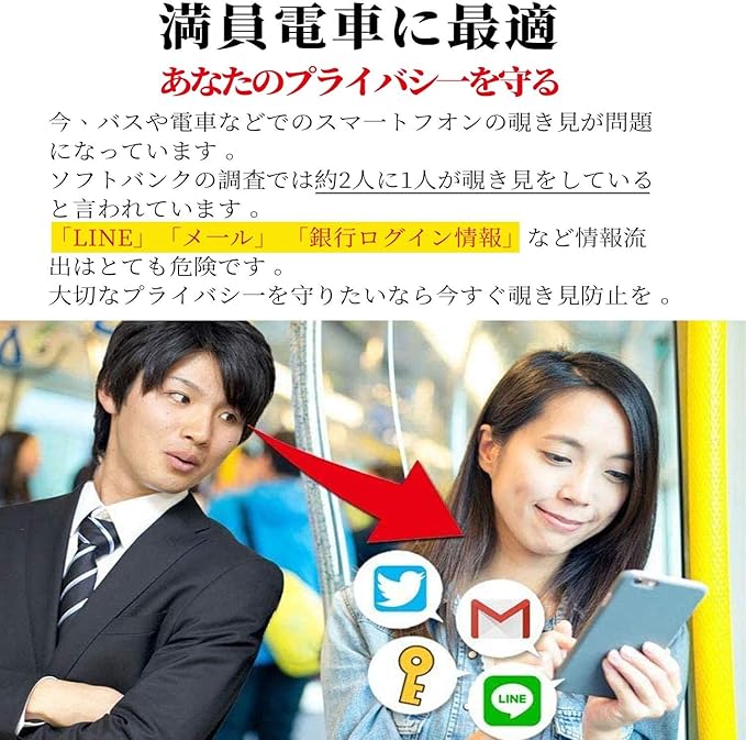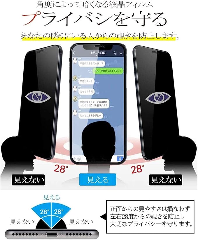 『覗き見防止 』特殊ブラインド加工で正面から画面はしっかり見えても、斜めからは画面が見えにくいので,覗き見防止ができます。電車や人が混み合う公共の場所で、安心してiPhoneを楽しむことができるようになりました。iPhoneが目線から28度傾くとディスプレイは見えなくなり、あなたのプライバシーを守ります。