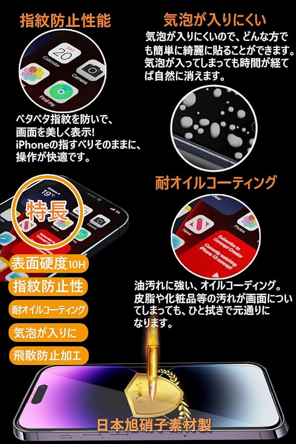 【日本旭硝子素材・最強硬度10H・飛散防止】ガラスフィルム一般的な液晶保護フィルムの約6倍の強度。衝撃は強化ガラスに吸収されますので、ディスプレイにかかる衝撃