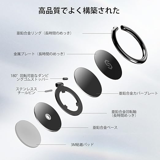 【強力な吸着力】強力な3M VHB粘着パッドがしっかりとスマホに吸着(耐荷重5kg)し、思わぬ落下を防ぎます。ご注意:1. 商品の表面に傷がある原因:リングの背面には青ビニールテープが貼られています。傷は薄い膜に付いていますので、使う時は外してください。2. 背面ガラスのケース:付属の静電ステッカーを貼ってからご使用ください。 接着力は他の素材よりも弱くなります。取り付けてから24時間は、スマホリングを使用しないでください。3. 凹凸のある表面、シリコーン、ゴム、皮革、コーティングガラスでの使用