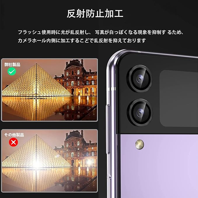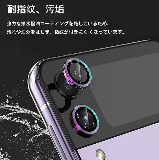 【高級感漂う単体仕上げ】Galaxy Z Flip4カメラフィルムGalaxy Z Flip4の独立型カメラために生まれた新作。フィルム全周はアルミ合金製リングとの融合で、本体のお洒落を向上しながら、ギャラクシーZ Flip4本体の色味にもぴったり、抜群な一体感、上品な見栄えでカメラの魅力を格段にアップ。それに薄0.3mmのデザインと0.5gの軽さで、分厚さやケースと干渉などの悩みは全くない、いつでも楽に使える。