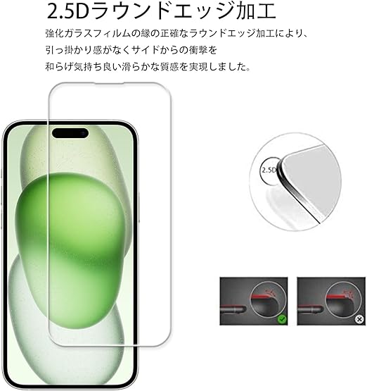 【対応機種】iPhone 15 / iPhone 16 ガラスフィルム*2枚+アイフォン15 / 16 保護フィルムガイド枠付き*1枚。【注意】この電話の画面の端は湾曲しているため、保護フィルムのサイズが丁度良い場合、しっかりと貼り付けられず、白いエッジやシェルとの干渉などの問題があるため、保護フィルムは画面よりも小さいです。