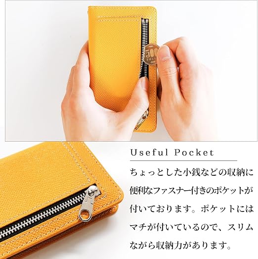 動画視聴など様々な場面で役立つスタンド機能とちょっとした小銭やレシート収納に便利なファスナーポケット付きの手帳型ケースです。