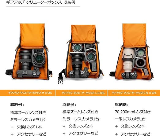【大きく開く収納スペース】収納例:70-200mmレンズ付きミラーレスカメラ+交換用レンズ2本+アクセサリーを収納可能