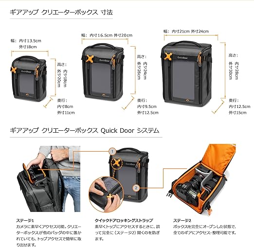 【QuickDoorで素早く機材にアクセス】バッグの中に入れた状態で簡単に機材の取り出しが可能。QuickDoorロックストラップを閉めれば不用意に開くことを防げる。