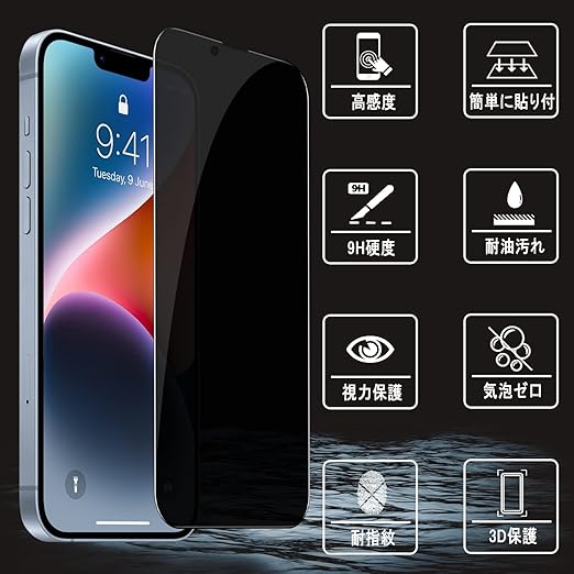 【覗き見防止】iPhone14 ガラスフィルム iPhone13 Pro/iPhone13 ガラスフィルム 液晶全面保護フィルム【専用貼り付けガイド枠付き】 硬度9H 3D曲線エッジ 貼り付け簡単 自動吸着 気泡防止 撥水撥油 指紋防止 飛散防止 iPhone14/iPhone13 Pro/iPhone13 液晶強化ガラス a