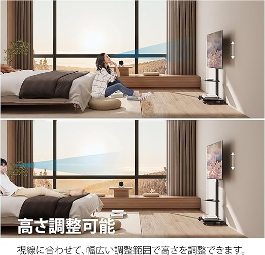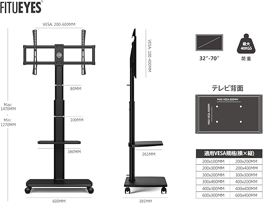 FITUEYES テレビスタンド 32〜70インチテレビに対応 キャスター付き 高さ角度調節可能 移動式 中段棚一枚付 棚板無階段調節 (ブラック) a