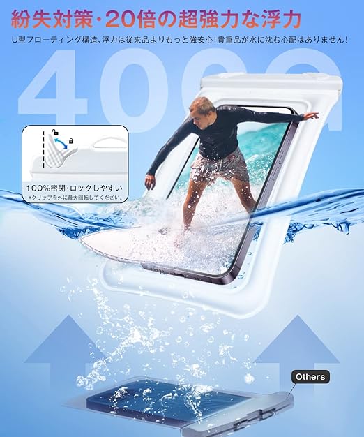 【IP68認証取得!超強防水防塵力】スマホ 防水ケースは防塵・防水国際保護等級のIP68認定を獲得、4層構造で完 全防水、完 全防塵性能を実現しました。革新的で開閉が簡単なレバーは、他の防水ポーチよりも30%強力で気密性に優れています。防塵、耐寒、耐傷、耐圧に強い95AのTPU素材で作られた、割れやすいPVCと普通TPUを替えて95AのTPUに採用し、耐摩耗耐圧性が大幅にアップ。スマホ防水ケースは水深30mの環境でも30分間の防水でき、全方位的な保護を提供でき、安心にお使いいただけます。携帯に防