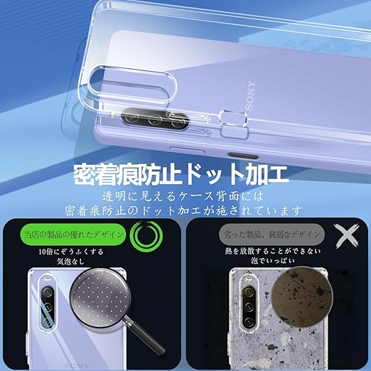 【驚きの透明感】高透明度の素材を採用し、Xperia10 V本来の美しさやカラーを楽しめます。またケース表面には油分防止コーティング加工を施すことにより、指紋を防ぎ、汚れなど付いても布で拭くときれいになります。変色も黄ばみも 有効に抑制する上に、透明感も溢れます。