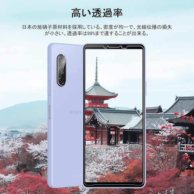 【高透過率】高品質の旭硝子を採用しており、光の透過率が99%で、透明度が普通のXperia 10 V ガラスよりも高くて、元々の画質が損なわれません。高画質な写真や動画を楽しむことができます。