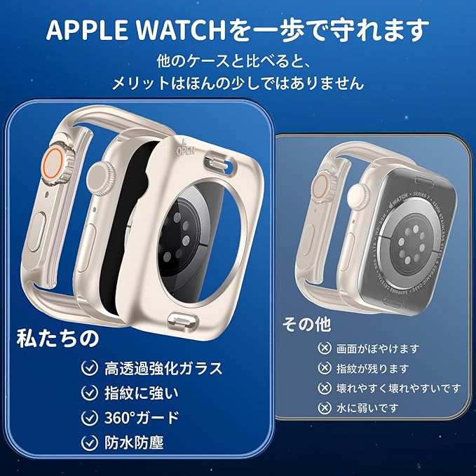【360ど度防水】Apple Watchケース特殊加工による防水機能により、 手を洗う時はもちろん汗をかいた時、シャワーを浴びた時にもかかわらずにアップルウォッチをご使用できます。 ※アップルウォッチ本来の防水性能を向上させるものではありません。プールや海などの水場でのご使用時はアップルウォッチの説明に従い、スキューバダイビング、ウォータースキーなど、水圧が高くなったり、所定の水深より深く潜るようなアクティビティはしないでください。
