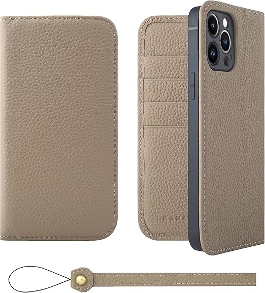 HANATORA iPhone13ProMax ケース 手帳型 本革 スマホケース スマホ スタンド ストラップ 付き シュリンクカーフレザー ギフト ベルトなし マグネットなし グレージュ H0XA-13ProMax-Grege a
