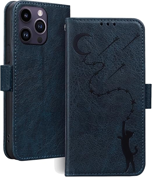 iPhone 15 pro max ケース いphone15pro max ケース アイフォン 15 プロマックス ケース 手帳型 スタンド機能 マグネット カード収納 ONETHEFUL iphone15 pro max ケース 流れ星と月猫柄 耐衝撃 全面保護 可愛い 猫柄 柔らかいTPU iphone15promax ケース 6.7inch - 濃紺 a