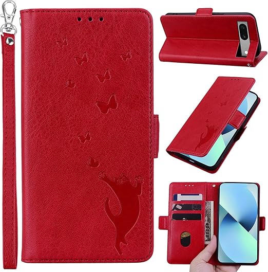 Kitzomi Pixel 7A ケース 手帳型 ピクセル7a ケース 手帳型 google pixel 7a 手帳型ケース グーグルピクセル7a ケース 蝶と猫の3Dパターン スタンド キャッシュポーチ リストストラップ プレミアム耐久性PUレザー 強い磁気吸引 リストストラップ 落下防止 スマホケース google pixel 7a 手帳型[フレイムレッド] a