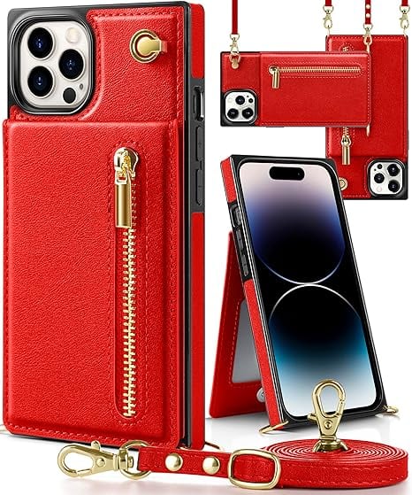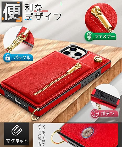 YIHARA iphone 15 Pro Max ケース手帳型 アイフォ15 プロマックス スマホ ケース 財布型 iPhone 15 Pro Max 適用 携帯ケース 肩掛け 首かけ 斜めがけ ショルダー アイフォン15 Pro Maxケース手帳型 背面 カード収納 ストラップ付き 上下開 長さ調整可能 レッド a