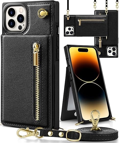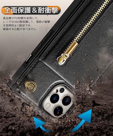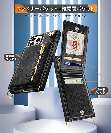 YIHARA iphone 15 Pro ケース手帳型 アイフォン15プロ スマホ ケース 財布型 iPhone 15 Pro 適用 携帯ケース 肩掛け 首かけ 斜めがけ ショルダー アイフォン15 Proケース手帳型 背面 カード収納 ストラップ付き 上下開 長さ調整可能 ブラック a