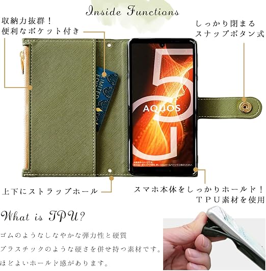 ◎手帳部分と内側ケース部分は接着しておりますが、強くめくったりひっぱると剥がれる場合がございます。内側のケースは黒TPUを使用し、本体をしっかりカバーします。電源ボタンや音量ボタンなどは、黒TPUケースの上から押す仕様となっております。カメラ部分などは機種に合わせた開口部が開いております。