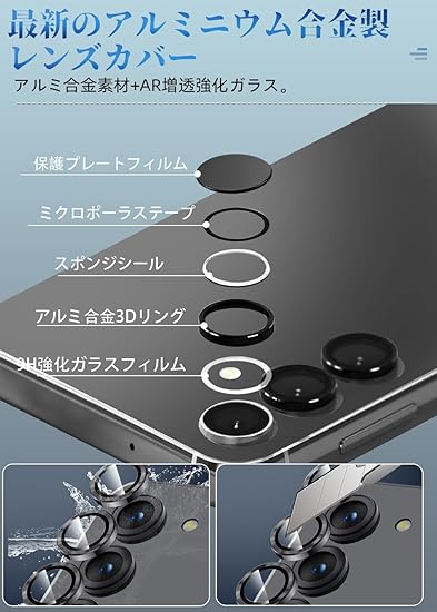 【高級感漂う単体仕上げ】Galaxy S24 カメラフィルムGalaxy S24 の独立型カメラために生まれた新作。フィルム全周はアルミ合金製リングとの融合で、本体のお洒落を向上しながら、ギャラクシーS24本体の色味にもぴったり、抜群な一体感、上品な見栄えでカメラの魅力を格段にアップ。それに薄0.3mmのデザインと0.5gの軽さで、分厚さやケースと干渉などの悩みは全くない、いつでも楽に使える。