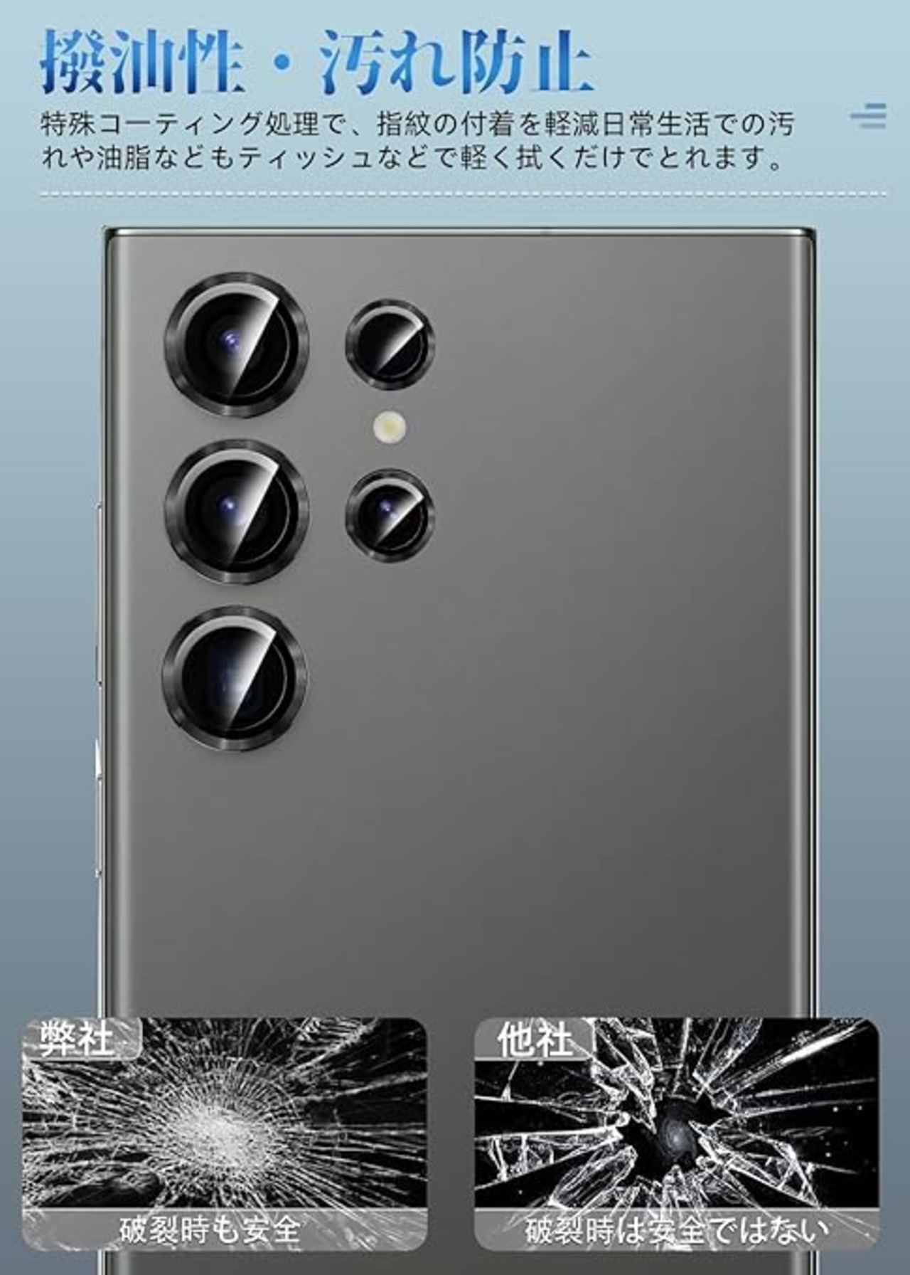 【高級感漂う単体仕上げ】Galaxy S24 Ultra カメラフィルムGalaxy S24 Ultra の独立型カメラために生まれた新作。フィルム全周はアルミ合金製リングとの融合で、本体のお洒落を向上しながら、ギャラクシーS24 Ultra本体の色味にもぴったり、抜群な一体感、上品な見栄えでカメラの魅力を格段にアップ。それに薄0.3mmのデザインと0.5gの軽さで、分厚さやケースと干渉などの悩みは全くない、いつでも楽に使える。