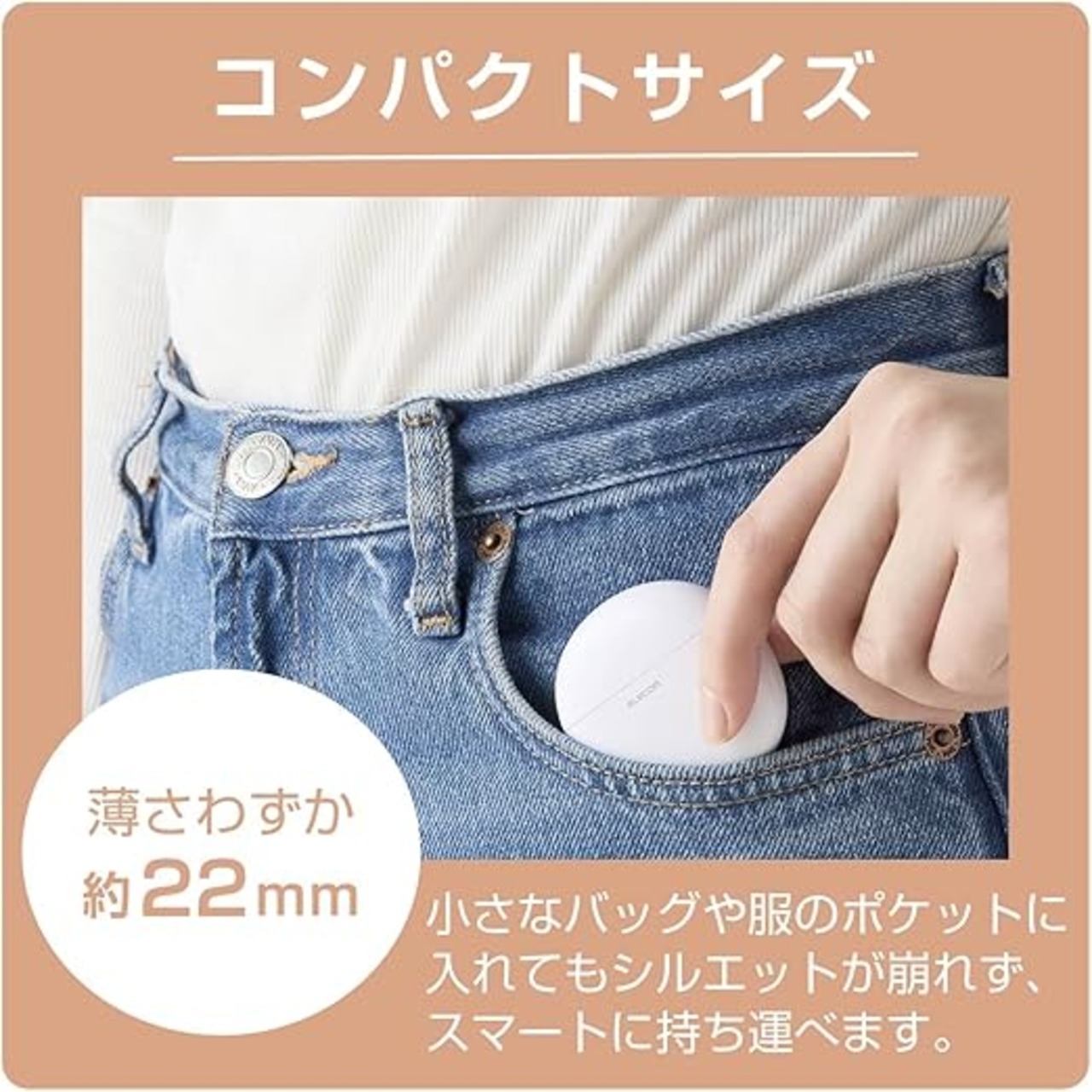 手のひらに収まるサイズの充電ケースは、約22mmの薄さ。小さなバッグや服のポケットに入れてもシルエットが崩れず、スマートに持ち運べます。