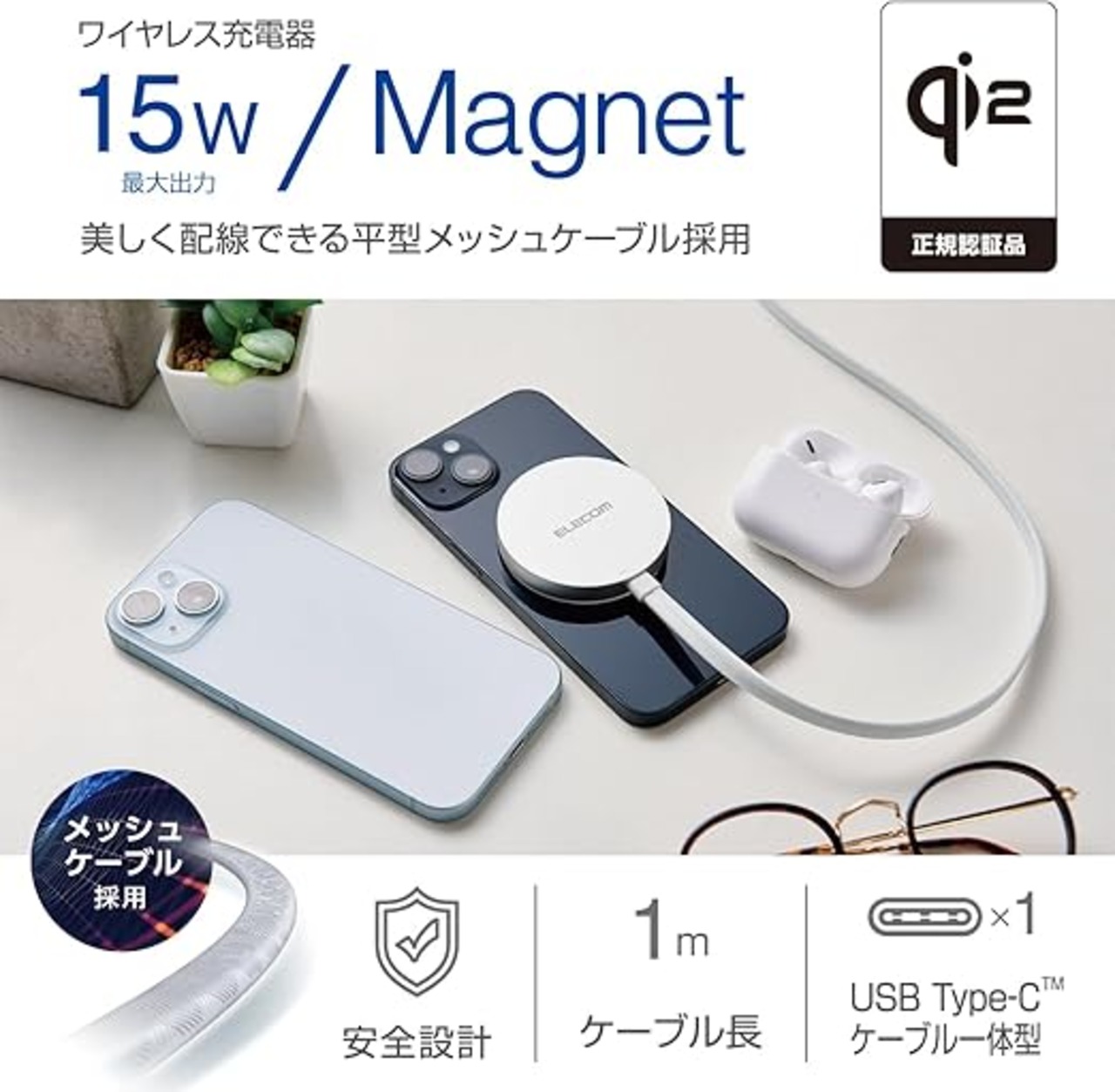 エレコム Qi2 ワイヤレス充電器 15W マグネット 正規認証品 卓上 メッシュケーブル 【 iPhone 15/14/13 シリーズに対応】 シルバー W-MA05SV a