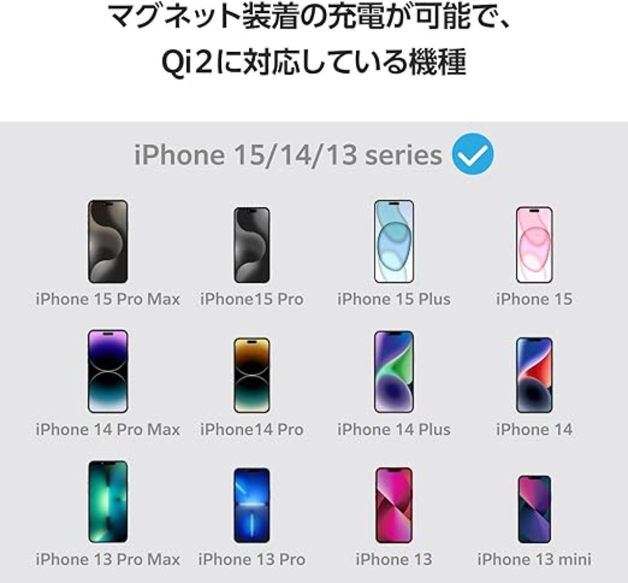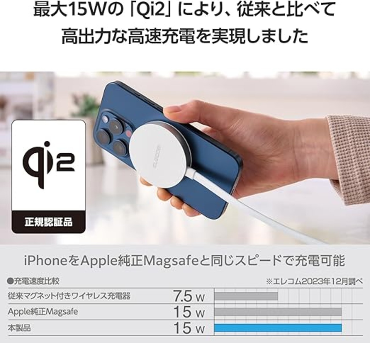 マグネットでQi2対応スマートフォンに固定するだけで高速充電できる、Qi2規格対応のワイヤレス充電器です。