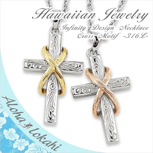 ハワイアンジュエリー ペアネックレス サージカルステンレス クロス スクロール 無限大 インフィニティ アクセサリー ペンダント【ローズゴールド&イエローゴールド】 a
