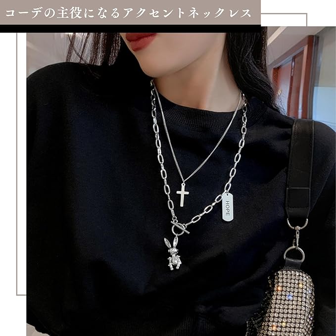 [ハルジオ] ネックレス レディース メンズ アクセサリー 2連 韓国 オルチャン 地雷系 量産型 パンク ストリート 闇 病みかわ 地雷 原宿 鎖 十字架 地雷系ネックレス うさぎ くま ドッグプレート プレート