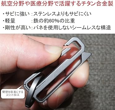 チタン合金製のベルト吊り下げ式カラビナです。チタン合金は航空宇宙分野で活躍するハイテク素材です。また、金属アレルギーを起こしにくいことから、歯科インプラントなどの医療分野でも活躍する素材です。そのようなスペシャルな素材で出来たベルトクリップです。