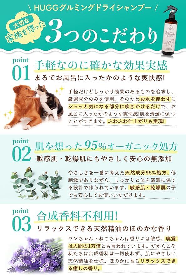 【水いらずで簡単、きれい】シュッと吹きかけるだけで気になる汚れや体臭(ニオイ)を分解除去する ペット用(犬猫兼用)グルーミングスプレー「HUGG ドライシャンプー」。肌にやさしい天然成分95%のオーガニック処方で徹底消臭・除菌!楽々、体臭匂い消し。