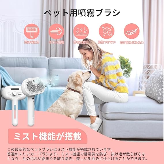 【2023年最新のミスト機能】従来品と違い、この最新的なペットブラシはミスト機能が搭載されています。普通のスリッカーブラシより、ミスト機能で静電気を防ぎ、抜け毛が散らばらなくなり、毛の汚れや絡まりを取り除き、美しい毛並みに仕上げることができます。水タンクに水、消臭剤などを入れて、噴霧スイッチを押すだけで、噴霧機能を起動できて水が超音波化にされ、繊細なミストを吹き出します。