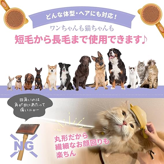 短毛から長毛まで対応! 猫ちゃんはもちろん、トイプードルやチワワ、柴犬など、種類や毛の長さに関わらずしっかりキャッチしてくれるブラシです。毛並みを整えるだけでなく、ペットとのコミュニケーションタイムが増えて、ケアがもっと楽しくなります。