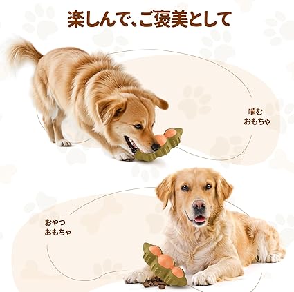 【知育おもちゃ】独特な枝豆形状はワンちゃんの注意を引き付けます。おやつを探しながらおもちゃをコロコロ転がすことで、ワンちゃんの体と頭脳を同時に鍛えることができます。大き目のサイズと少々重みがある(200g)ため、中型~大型犬に最適です。