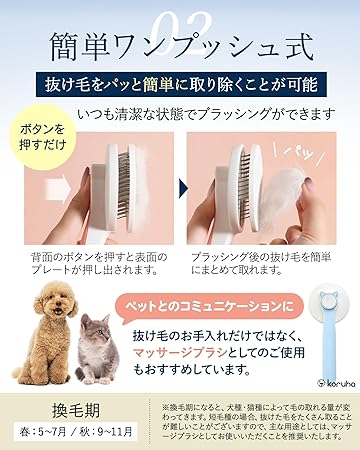 《ワンちゃん猫ちゃん、飼い主さんがうれしい!4つのポイント》 1.力を入れる必要のない持ちやすい形状 2.皮膚に触れても負担の少ない丸型の先端 3.ワンプッシュで抜け毛の処理が簡単 4.約76g軽量