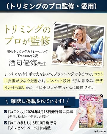 工場累計集荷個数500万個突破!(2023年12月1日時点) 雑誌「ねことも」2024年4月16日発行号、「ねこのきもち」6月10日発行号にも掲載された、トリミングのプロ監修のペットブラシです。抜け毛のお手入れだけではなく、マッサージブラシとしてもおすすめ◎主に小型犬や猫ちゃんにお使いください♪