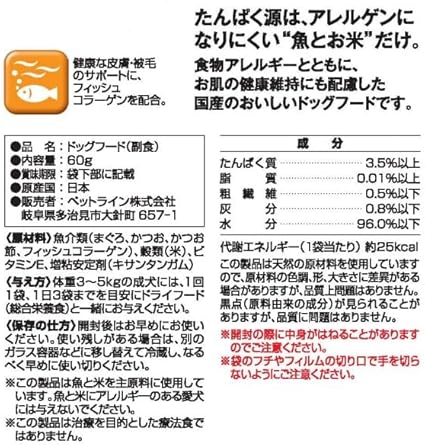 原材料:魚介類(まぐろ、フィッシュエキス、マリンコラーゲン)、穀類(米、米粉)、油脂類(植物性油脂、魚油:DHA・EPA源)、ビタミンE、増粘多糖類